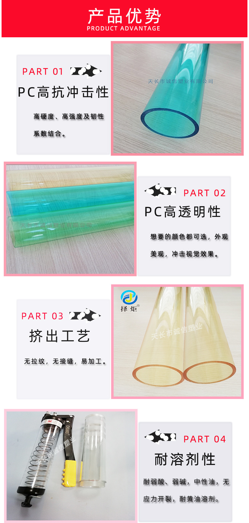 公司經(jīng)過(guò)長(zhǎng)期以來(lái)的生產(chǎn)實(shí)踐和創(chuàng)新完善,選用進(jìn)口原材料,使用新型大型生產(chǎn)設(shè)備生產(chǎn)的高透明度PC管/型材系列產(chǎn)品,更好的滿足了國(guó)內(nèi)外客戶的高品質(zhì)要求,深受?chē)?guó)內(nèi)外市場(chǎng)歡迎和好評(píng)。